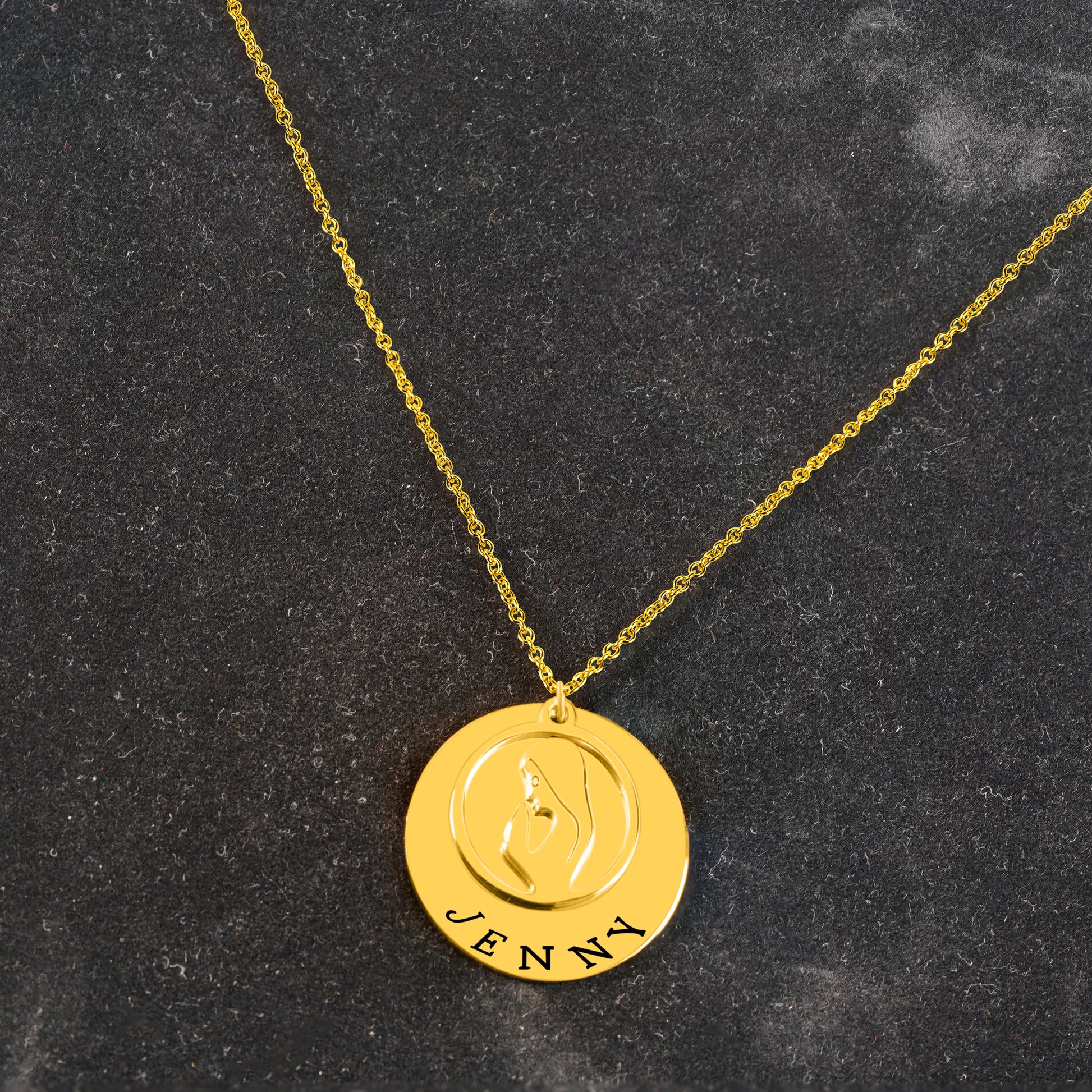 This pendant necklace is a beautiful 18k gold vermeil piece. Easily customizable with a choice of font to your liking. Features 1 Holy Mary Pendant (20mm) & 1 Personalized Pendant (30mm x 1.5mm) on a gold plated chain. Personalize yours with names, dates, initials, short phrases or one of our hand-illustrated symbols.