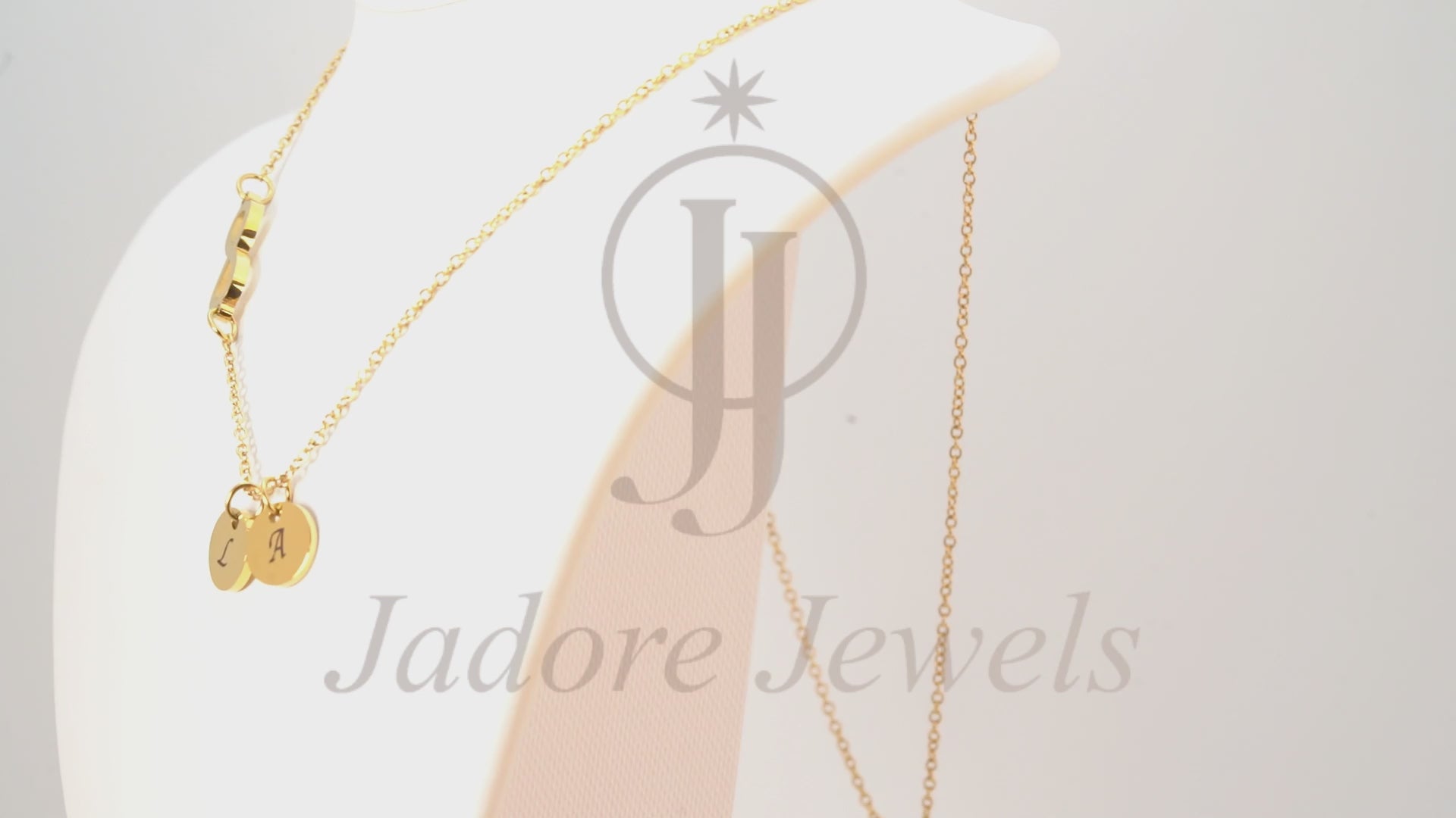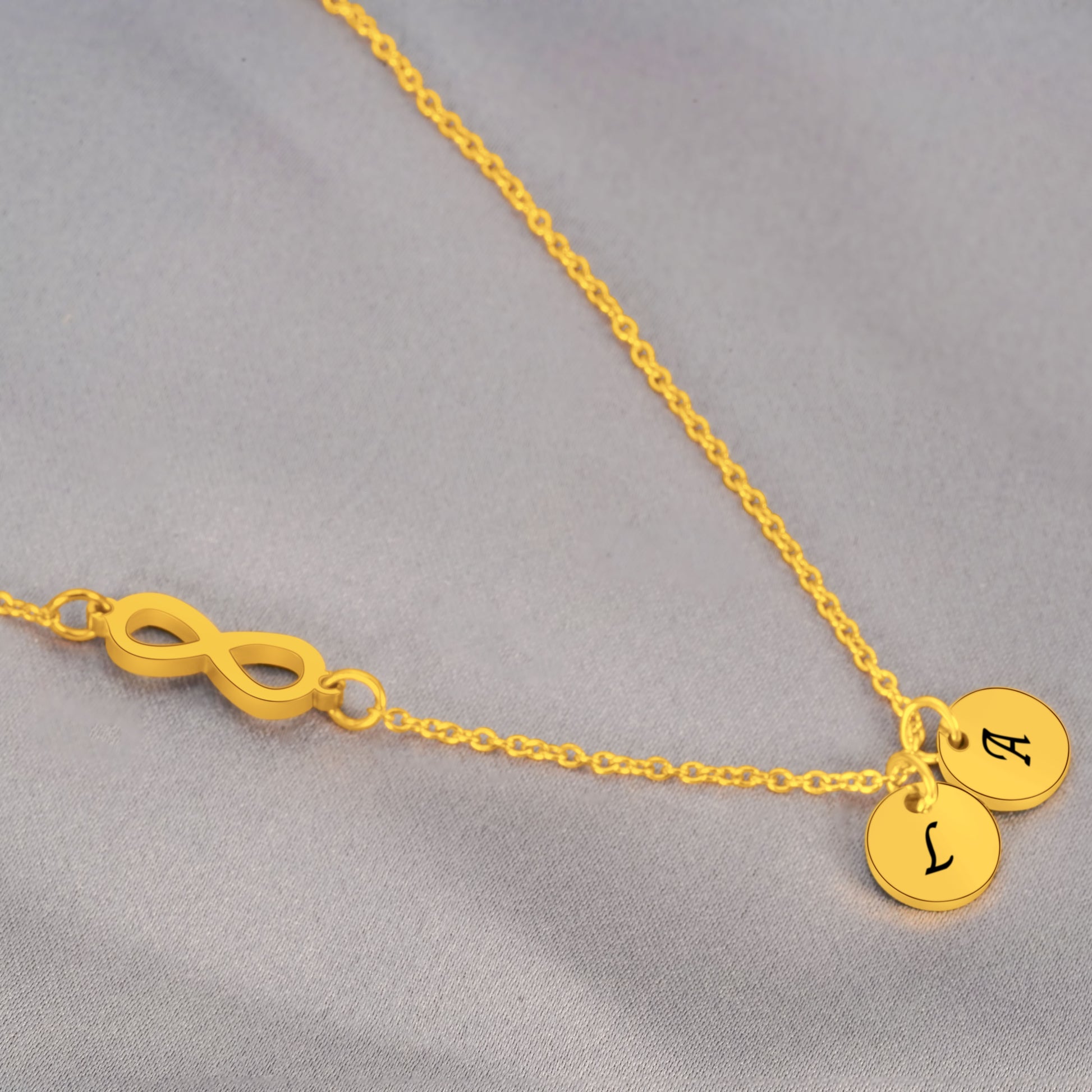 This pendant necklace is a beautiful 18k gold vermeil piece. Easily customizable with a choice of font to your liking. Features Infinity Pendant (17mm x 7mm x 1.5mm) 2 x Circular Pendants (10mm x 1.5mm thick) on a gold-plated chain. Personalize yours with names, dates, initials, short phrases or one of our hand-illustrated symbols.