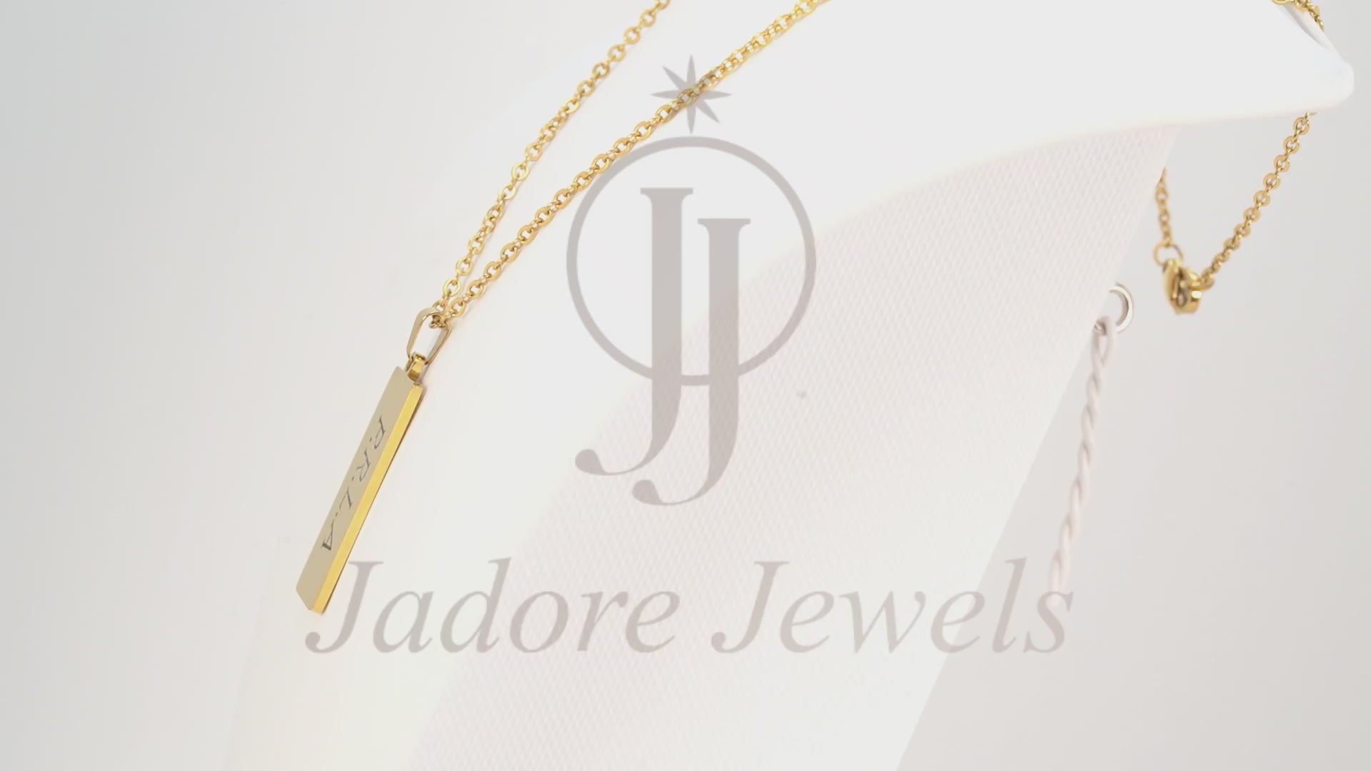 This bar pendant necklace is a beautiful 18k gold vermeil piece. Easily customizable with a choice of font to your liking. Features a 29mm x 11.5 mm rectangular pendant on a 17.5" gold wine chain.