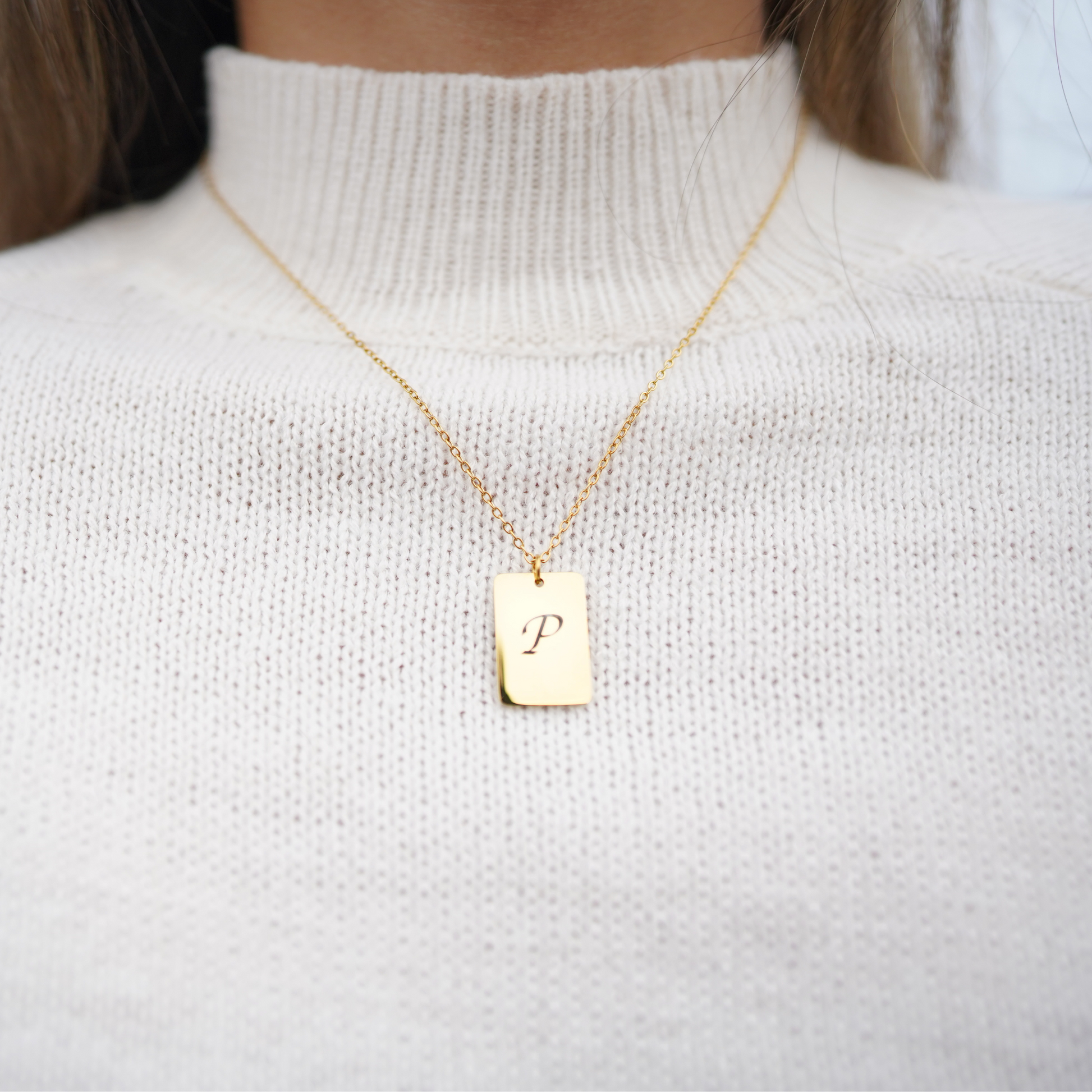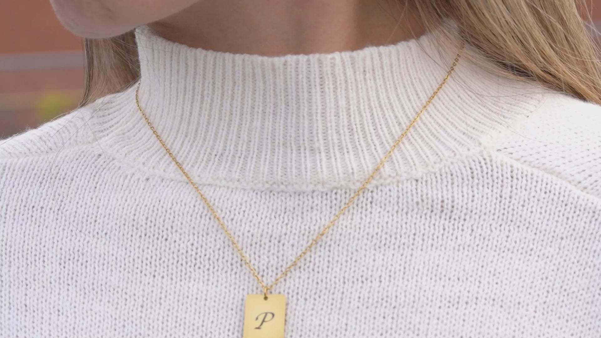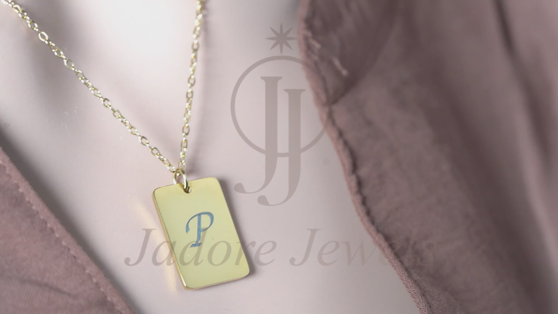 This bar pendant necklace is a beautiful 18k gold vermeil piece. Easily customizable with a choice of font to your liking. Features a 15mm x 22 mm rectangular pendant on a 17" gold wine chain.